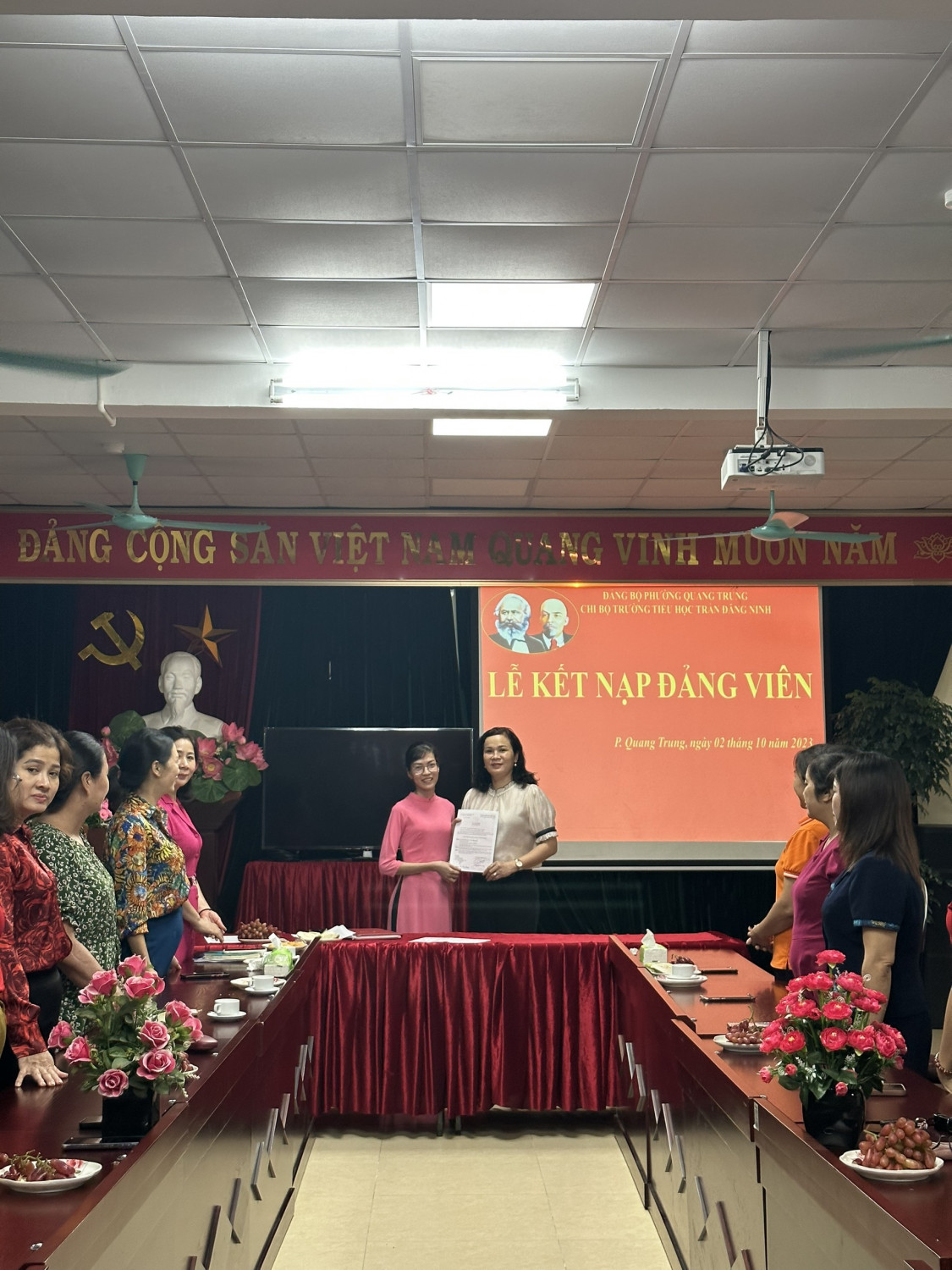 Đ/c Nguyễn Thị Hương Giang – Bí thư Chi bộ, Hiệu trưởng nhà trường trao Quyết định kết nạp đảng viên.