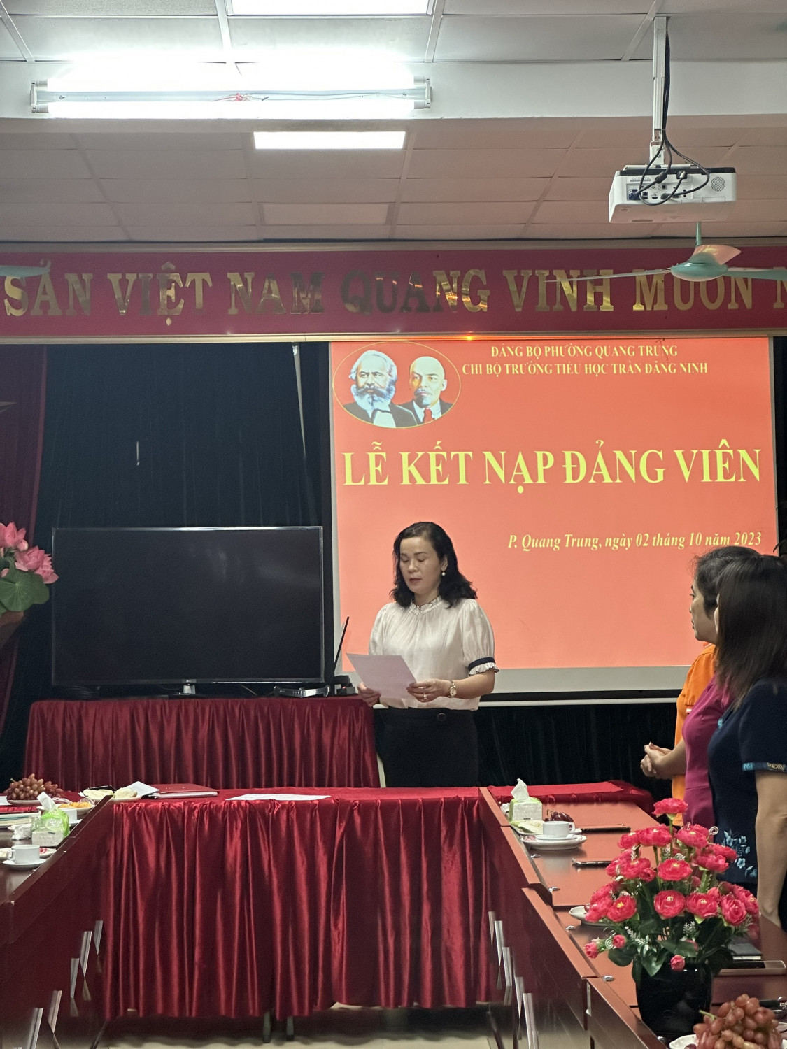 Đ/c Nguyễn Thị Hương Giang – Bí thư Chi bộ, Hiệu trưởng nhà trường đọc Quyết định kết nạp đảng viên.
