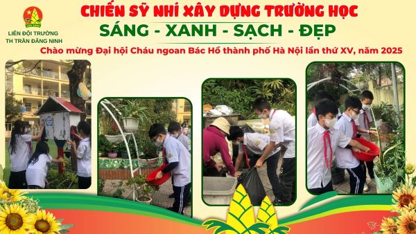"Chiến sỹ nhí xây dựng trường học sáng - xanh - sạch - đẹp" Chào mừng Đại hội Cháu ngoan Bác Hồ thành phố Hà Nội lần thứ XV . Thu hút 100% học sinh Trường Tiểu học Trần Đăng Ninhhưởng ứng và thực hiện các hoạt động vệ sinh trường lớp tạo không gian học tập trong lành và thân thiện.