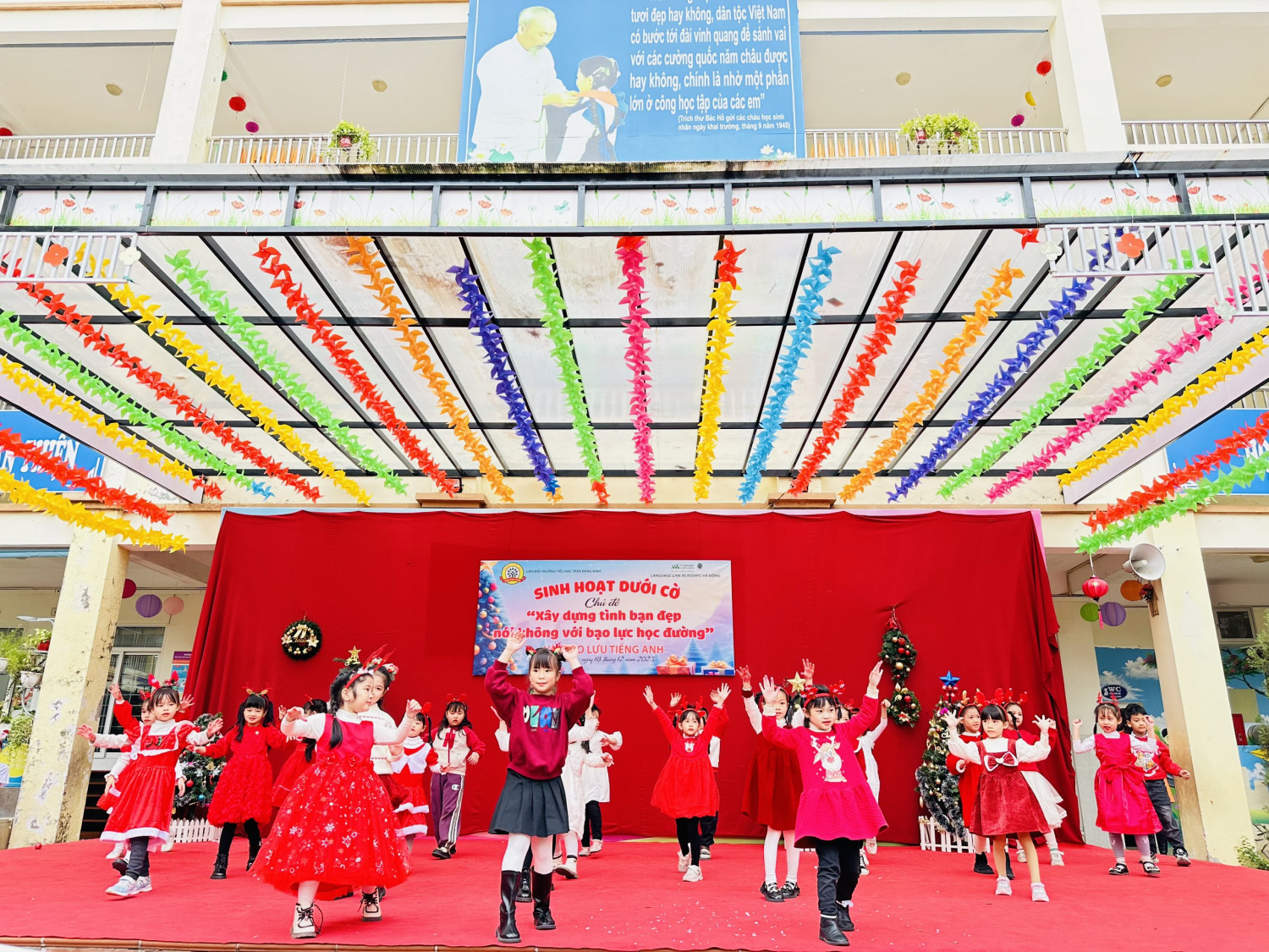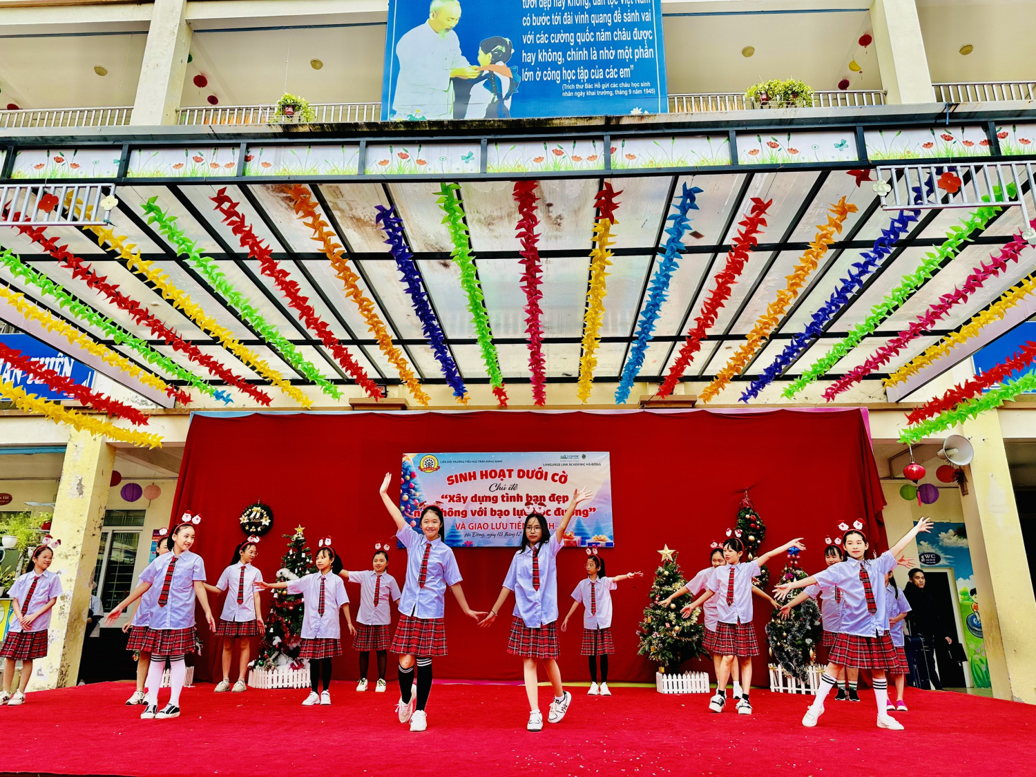 Thực hiện chương trình công tác Đội và phong trào thiếu nhi năm học 2023 – 2024, vào sáng thứ Hai ngày 18/12/2023, trường Tiểu học Trần Đăng Ninh đã tổ chức sinh hoạt dưới cờ với chủ điểm “Xây dựng tình bạn đẹp, nói không với bạo lực học đường”. Đây là một hoạt động ý nghĩa nhằm giáo dục học sinh về tầm quan trọng của tình bạn trong cuộc sống, cũng như phòng ngừa và xử lý các tình huống bạo lực trong môi trường học tập. Trong buổi sinh hoạt, các em học sinh lớp 5A4. 1A1, 1A3, 1A4 đã thể hiện sự sáng tạo và năng động qua các tiết mục như: thuyết trình,đóng kịch và đọc thơ. Các em đã truyền tải được thông điệp về nét đẹp của tình bạn, những yếu tố tạo nên tình bạn đẹp. Bên cạnh đó, các em đã tuyên truyền về những biểu hiện và hậu quả của bạo lực học đường, đồng thời đưa ra các kỹ năng xử ký phù hợp khi gặp các trường hợp bị bạo lực học đường. Buổi sinh hoạt đã thu hút sự quan tâm và tham gia tích cực của toàn thể học sinh trong trường. Đây là một hoạt động có ý nghĩa giáo dục cao, góp phần nâng cao nhận thức về tình bạn đẹp và kỹ năng sống cho học sinh, tạo nên một môi trường học tập thân thiện, an toàn, vui tươi và hạnh phúc. Buổi sinh hoạt dưới cờ còn hấp dẫn bởi hoạt động trải nghiệm “Tìm kiếm tài Anh ngữ”. Đây là một cơ hội để các em thể hiện năng khiếu học tiếng anh của mình qua các hình thức giao lưu với trung tâm Tiếng Anh Language Link Academic Hà Đông. Các em đã trả lời các câu hỏi về Văn hóa lễ hội các vumgf miền. Đây là một hoạt động bổ ích và thú vị, các em học sinh được khẳng định bản thân, giúp các em tự tin trong học tập và trong cuộc sống.