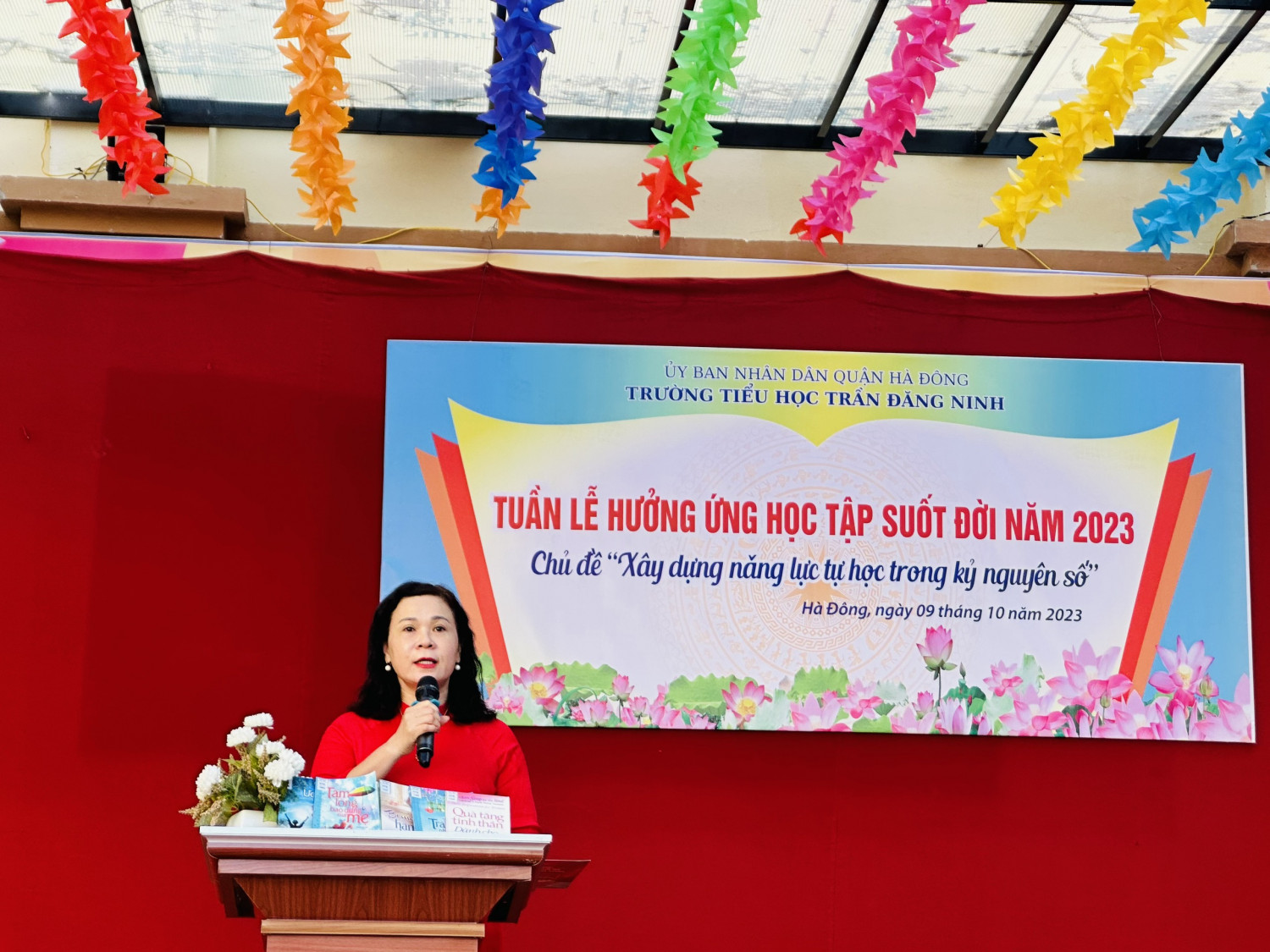Cô giáo Nguyễn Thị Hương Giang - Bí thư Chi bộ - Hiệu trưởng nhà trường phát biểu hưởng ứng Tuần lễ học tập suốt đời năm 2023