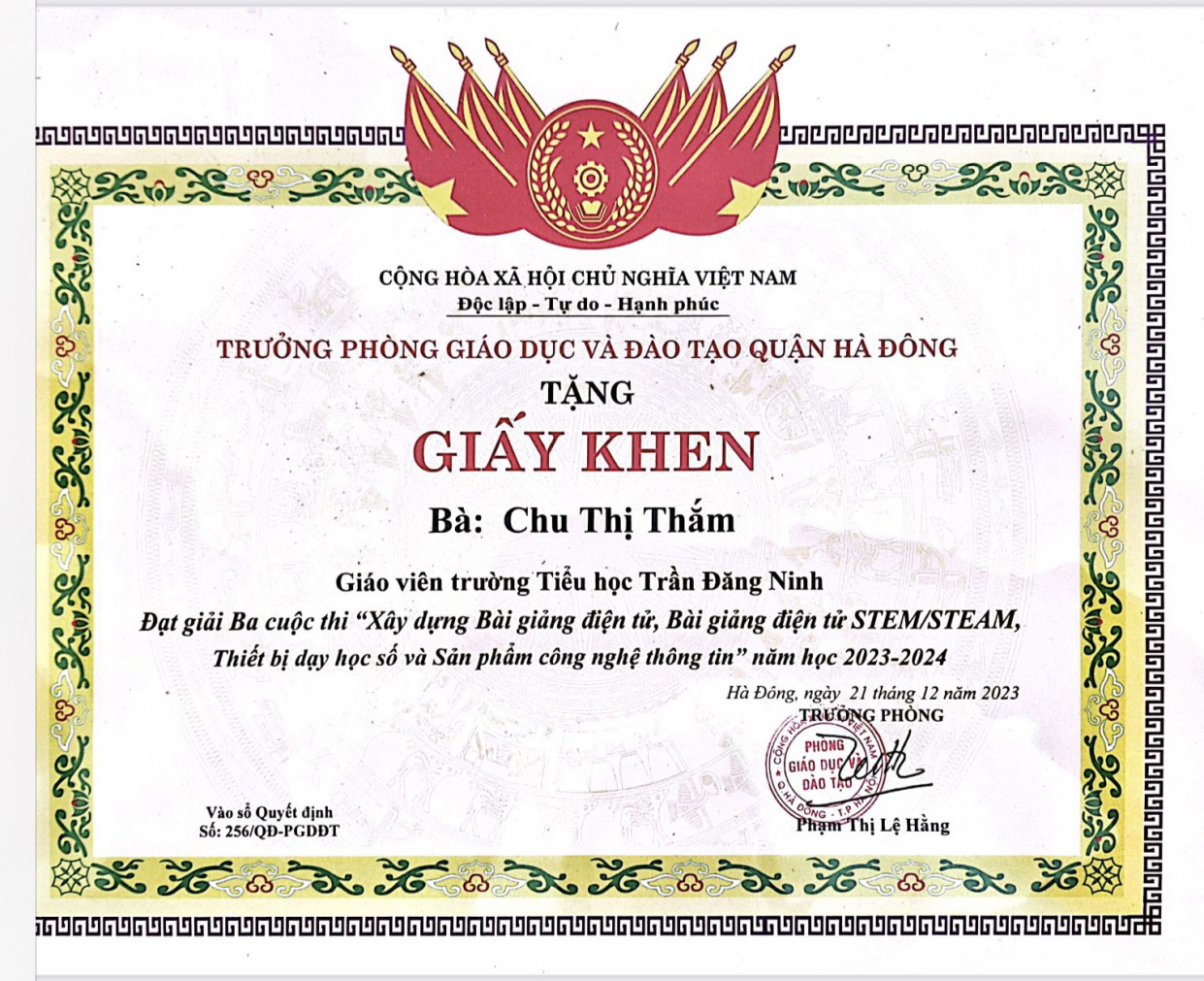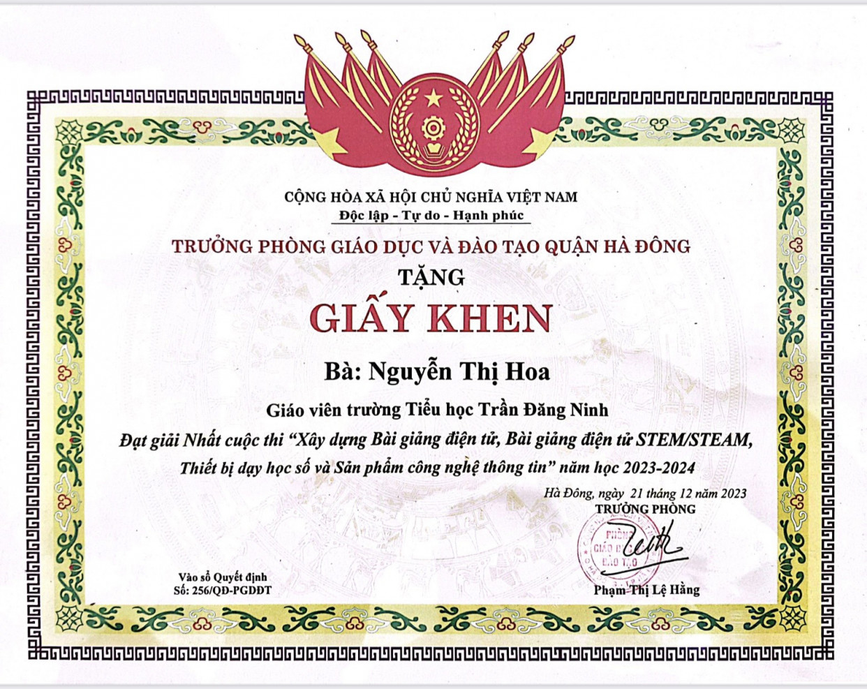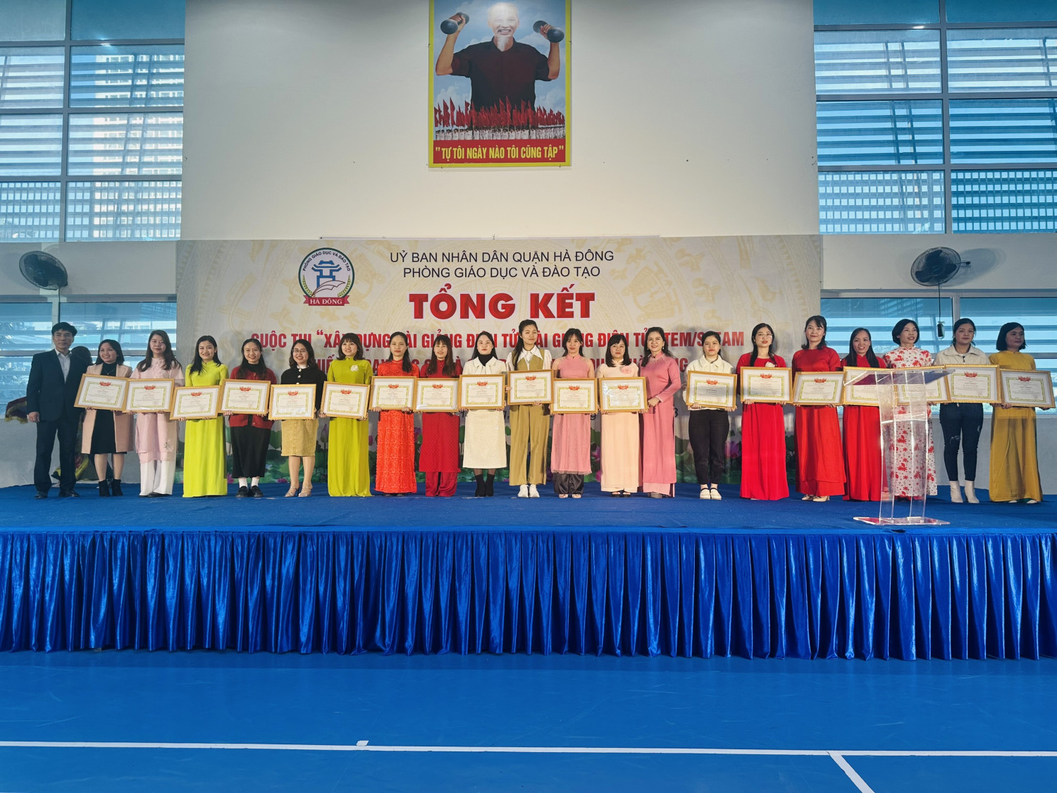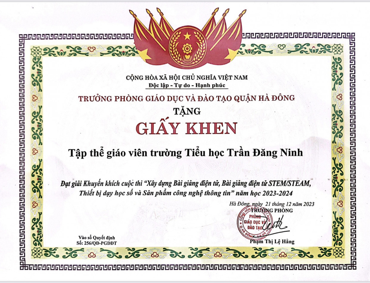 Ngày 25/12/2023, phòng Giáo dục và Đào tạo Hà Đông tổ chức lễ tổng kết và trao giải cuộc thi Thiết kế bài giảng điện tử năm 2023-2024. Đây là Hội thi thiết kế bài giảng điện tử và Bài giảng điện tử STEM/STEAM, Thiết bị dạy học số và sản phẩm công nghệ thông tin dành cho các thầy cô giáo để học hỏi và chia sẻ kinh nghiệm trong thời đại công nghệ số. Mỗi sản phẩm dự thi đều là tâm huyết của các tác giả. Với phương pháp dạy học lấy học sinh làm trung tâm, từng slide, từng video, từng hình ảnh của thầy cô trong bài giảng điện tử đều chất chứa niềm tin, niềm hy vọng mang lại những điều tốt đẹp nhất cho người học. Cuộc thi không những giúp thầy cô làm quen và làm chủ công nghệ, công cụ mà còn tích cực đổi mới sáng tạo trong công tác dạy và học, trau dồi kỹ năng, công nghệ. Tham gia hội thi, trường Tiểu học Trần Đăng Ninh đạt 03 giải: * 01 giải Nhất của cô giáo Nguyễn Thị Hoa – GVCN lớp 2A3 với sản phẩm Banif giảng điện tự Elearning. * 01 giải Ba của cô giáo Chu Thị Thắm – phó Hiệu trưởng với sản phẩm Thiết bị dạy học số. * 01 giải Khuyến khích cho nhóm tác giải (tập thể giáo viên khối 4). Sau đây là hình ảnh trong lễ tổng kết hội thi: