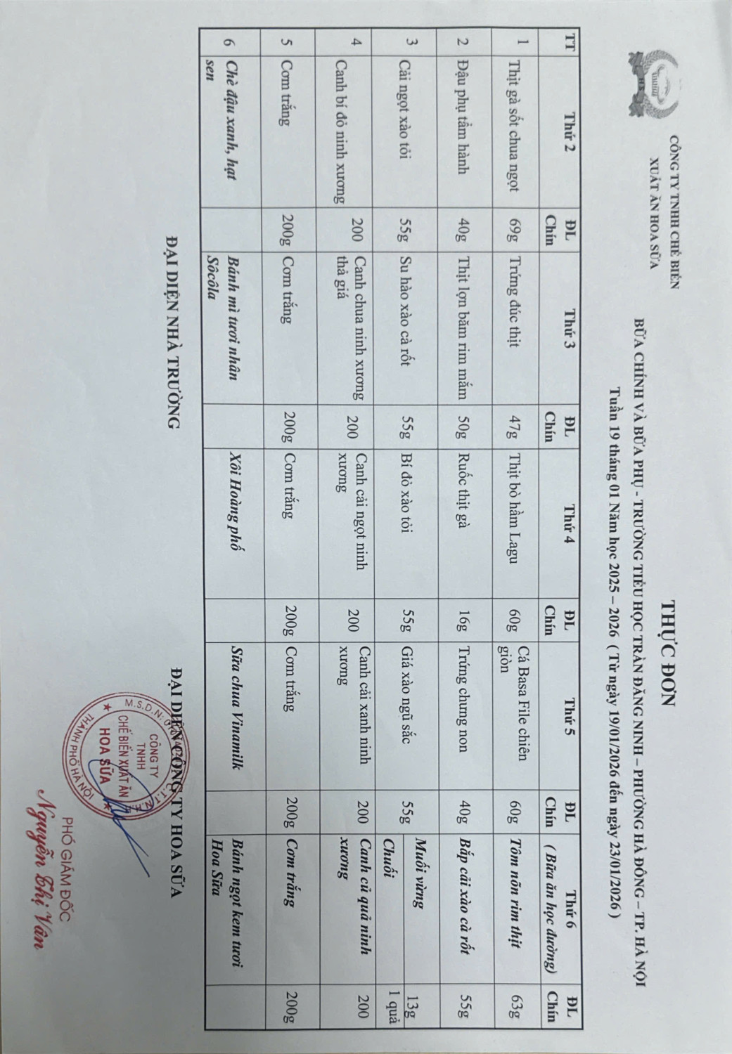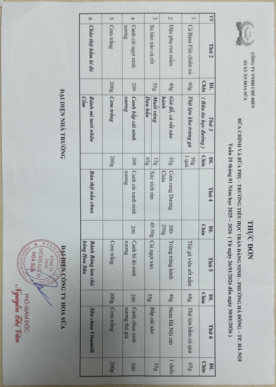 Thực đơn bán trú trường Tiểu học Trần Đăng Ninh tuần 19, 20 (từ 19/1/2026-30/1/2026)