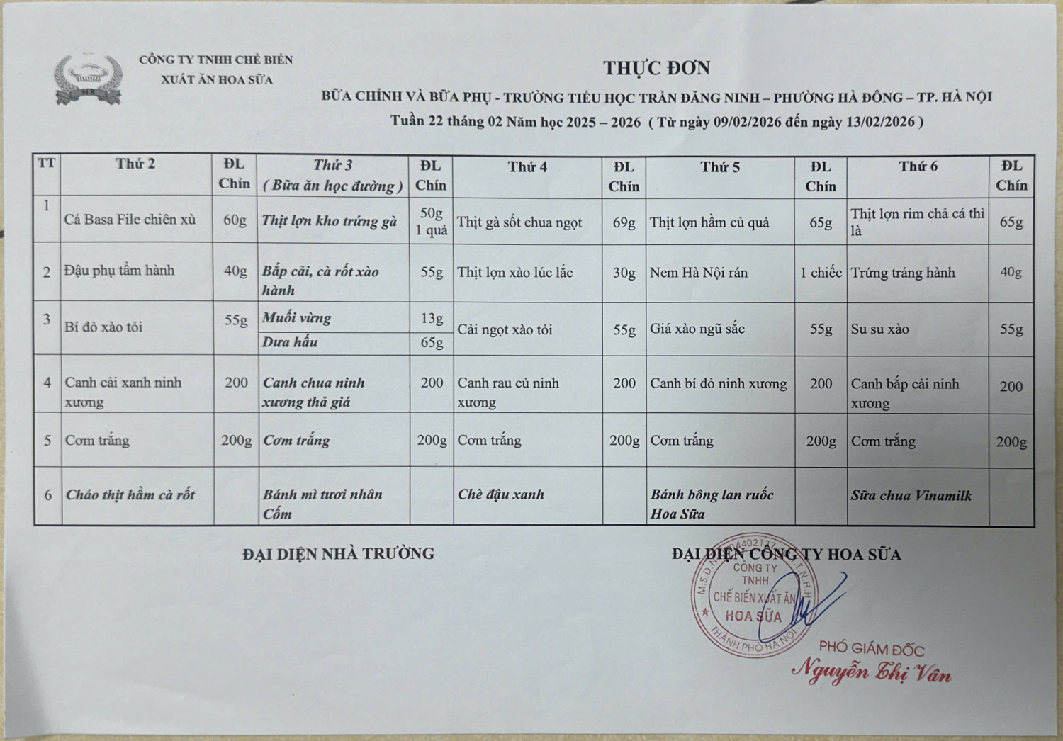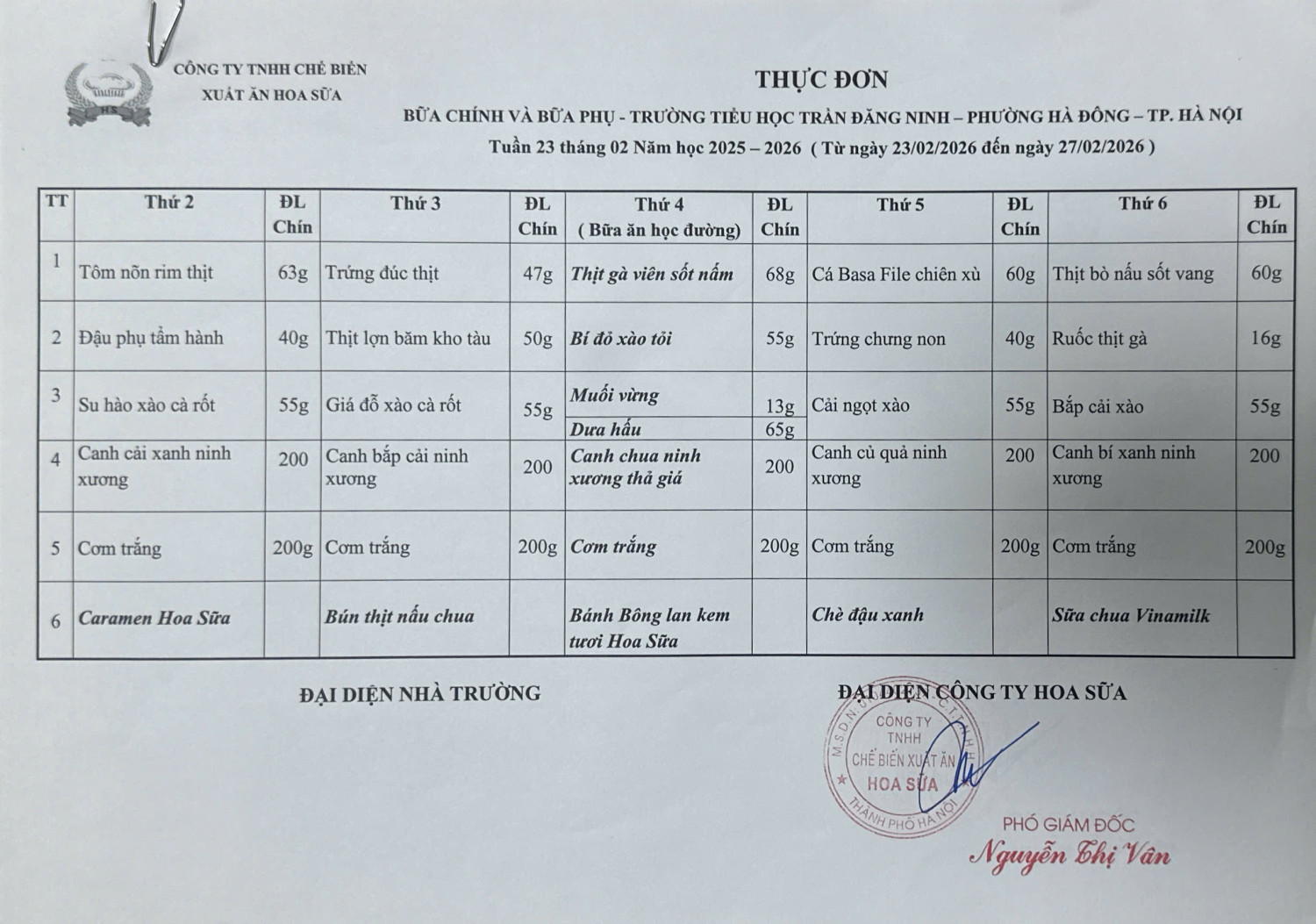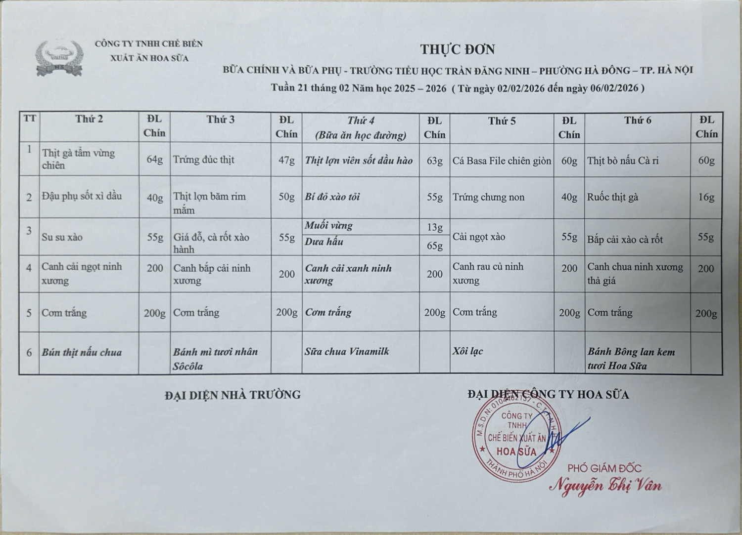 Thực đơn bán trú trường Tiểu học Trần Đăng Ninh tuần 21, tuần 22, tuần 23 (từ 02/2/2026-27/2/2026)