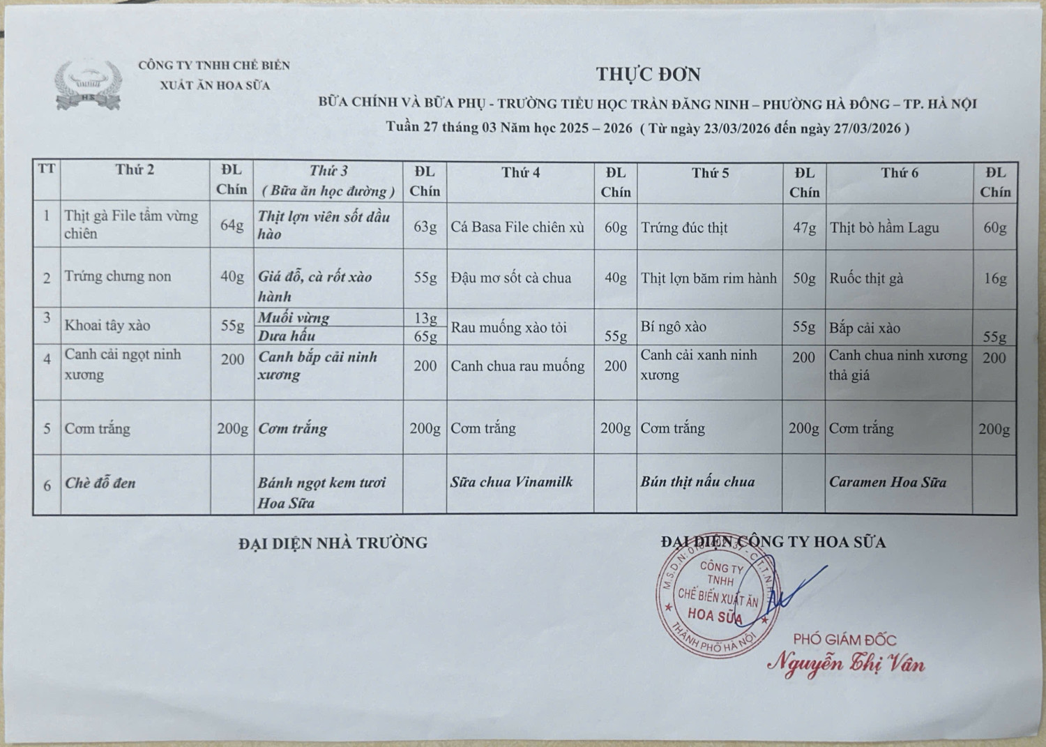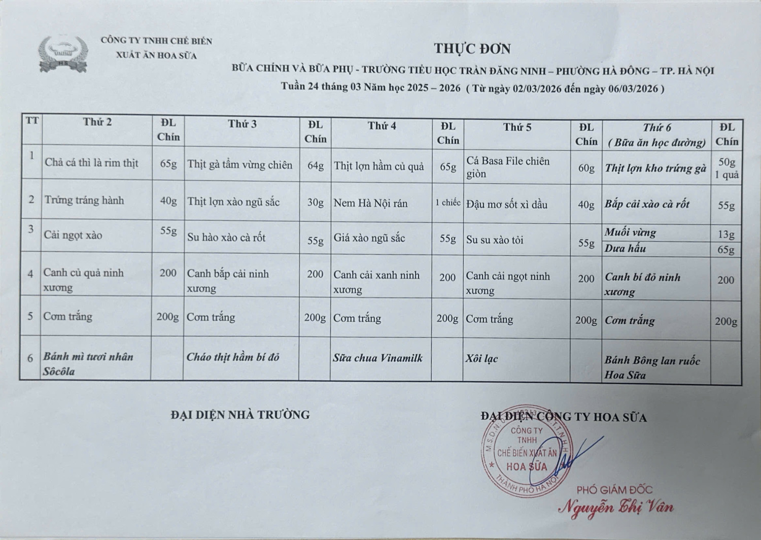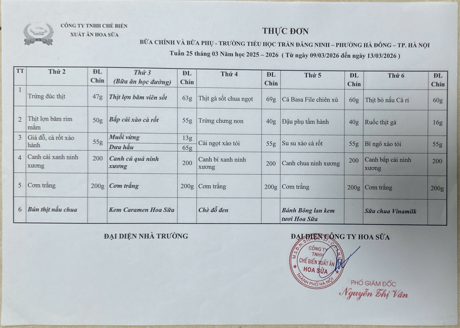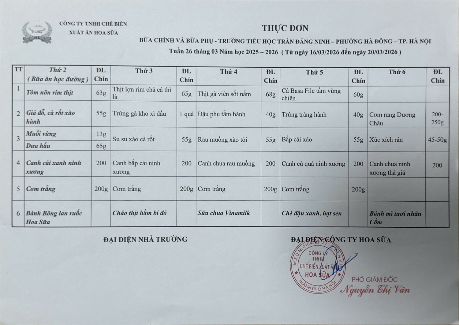 Thực đơn bán trú trường Tiểu học Trần Đăng Ninh tuần 24, tuần 25, tuần 26, tuần 27 (từ 02/3/2026-27/3/2026)